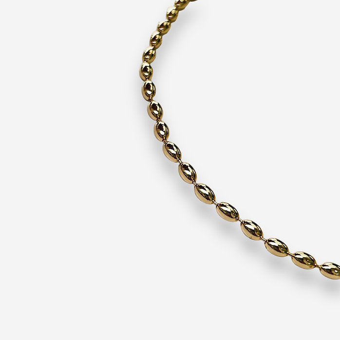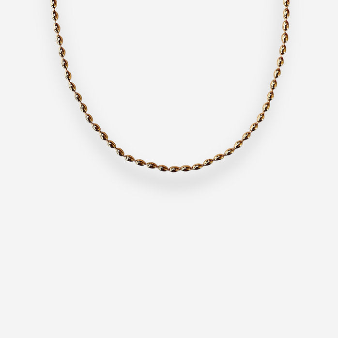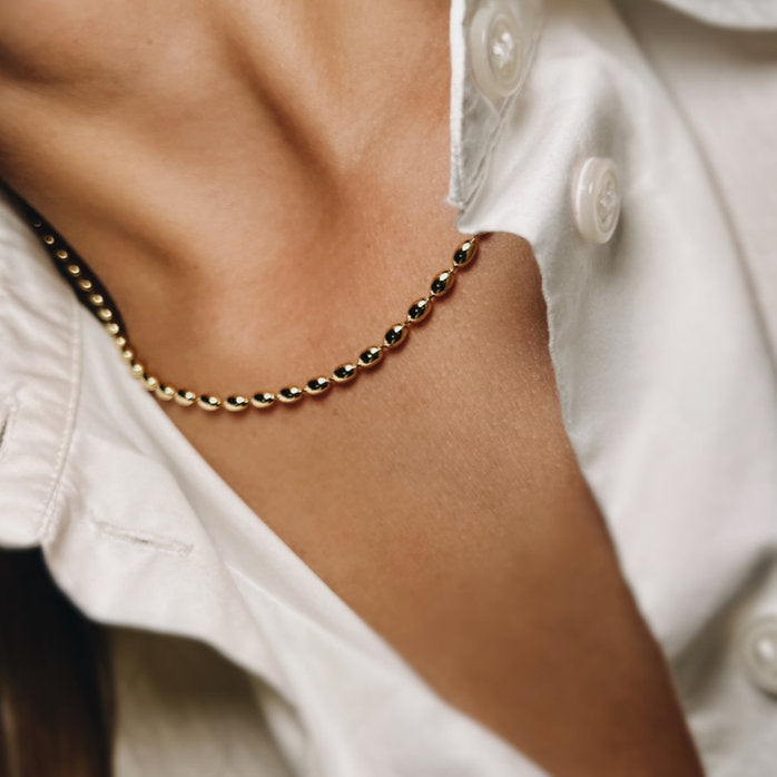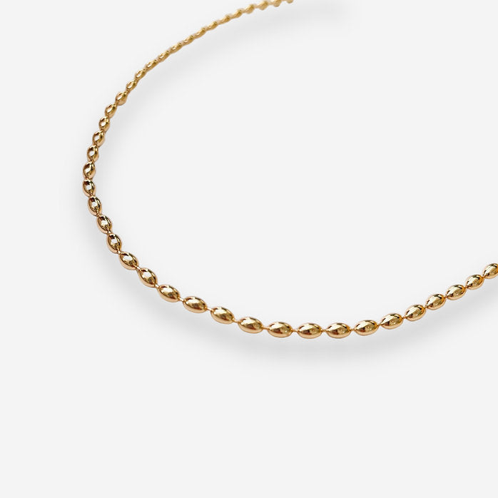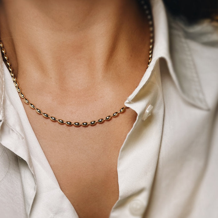 La Cadena Dorada Tejido Arroz es un clásico renovado que combina elegancia, textura y versatilidad. Su diseño de eslabones en forma de grano de arroz refleja la luz de forma sutil, haciéndola perfecta para usar sola o en layering.