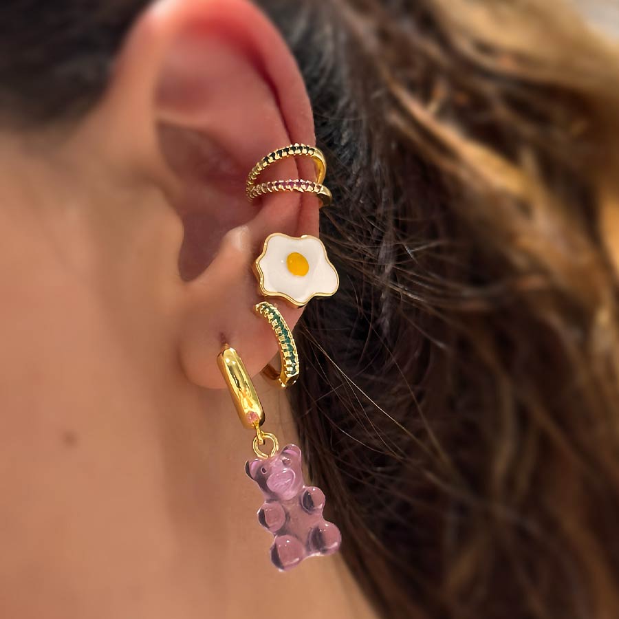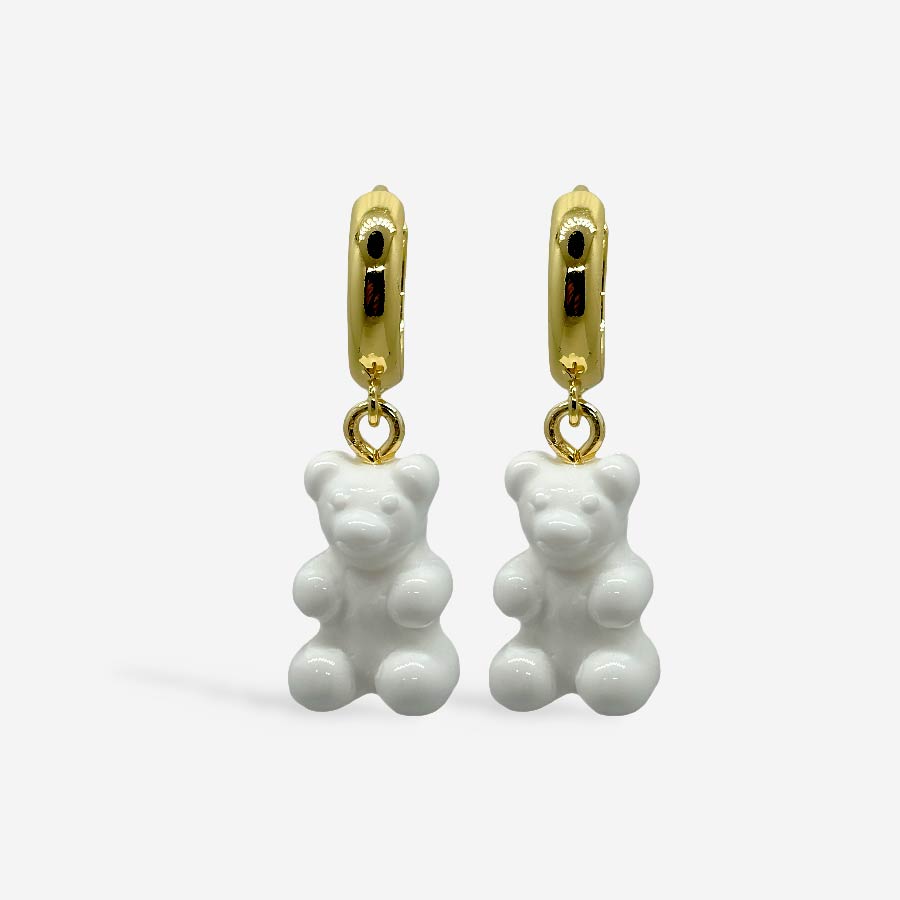 - Material Candongas: Bronce con baño de rodio y oro de 18K, el dije de gummy bear es en resina. El enlace que une el dije con la candonga es en golfied.